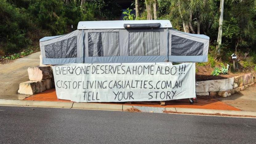 An Australian man who said he is unable to keep up with rental housing costs despite having two jobs has set up a tent and protest sign outside of the luxury New South Wales Central Coast residence owned by Prime Minister Anthony Albanese.