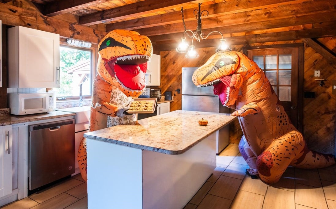 Jonathan Benton of East Key Realty is promoting a property in Londonderry, New Hampshire, by featuring a family of inflatable Tyrannosaurus Rexes as the residents of the house. The dinosaur family is shown playing in the front yard and back yard, making cookies in the kitchen and relaxing in the family room. The property’s listing is joke- and pun-heavy in describing the “dino-mite two car garage and finished basement,” bedrooms with “vaulted ceilings big enough to make a pterodactyl jealous” and a kitchen that is a “T-Rexcellent space for any chef.”