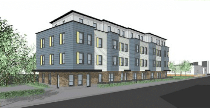 The new transit-oriented development will be comprised of two four-story buildings that will accommodate households at 30%, 50%, 60% and 80% of the area median income (AMI). Eight units will receive project-based Section 8 vouchers, another eight units will be a part of the Massachusetts Rental Voucher program, and nine units will be set aside for households formerly experiencing homelessness. Both buildings will have rooftop solar panels and common area amenities will include laundry facilities, a picnic area, activity room, community garden, controlled access, and bicycle parking.