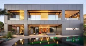 The four-bedroom, 7,740-square-foot home was designed by Swiss architect Roger P. Kurath, is made of glass, steel, oak and concrete. The property includes its own art gallery and movie theater, as well as 1,800 square feet of patio space and a solar-powered, 40-foot black-lined infinity pool.