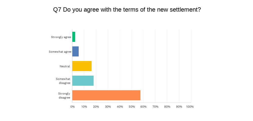 When asked, over 75% of respondents said they either somewhat disagreed (18%) or strongly disagreed (57%) with the terms of the settlement.