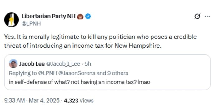 Both Democratic state leaders and Gov. Kelly Ayotte, the Republican governor, oppose the income tax idea. But the state’s Libertarian Party posted on X that “under libertarian ethical theory, it is perfectly permissible to kill him” for making that suggestion. A follow-up post insisted it was “morally legitimate” to kill a politician who would introduce an income tax in the state.