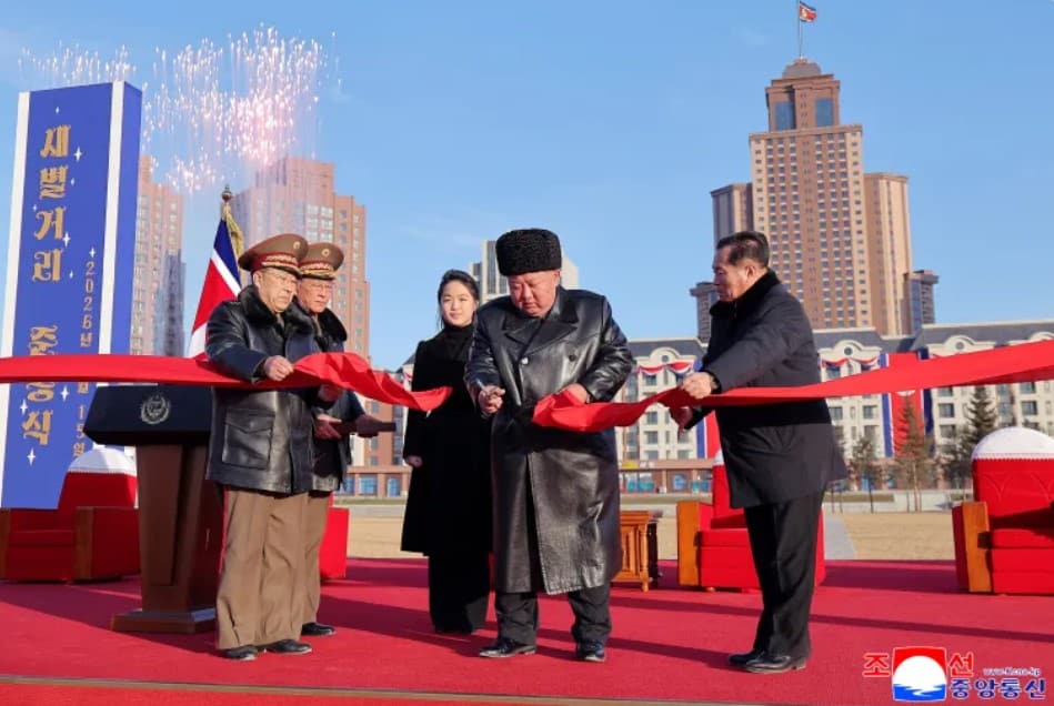 Photo of Kim Jong-un and his daughter, Kim Ju-ae, opening the new housing district; photo via the state-owned Korea Central News Agency
