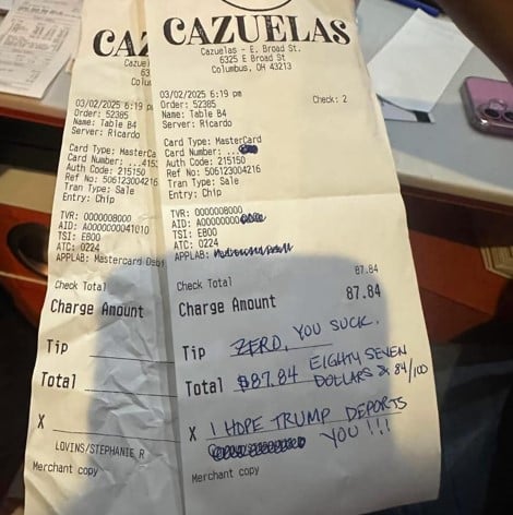 NBC4i.com reports a server at Cazuelas Mexican Cantina in Columbus, Ohio, shared the receipt from a March 2 transaction. The restaurant patron wrote “Zero. You Suck.” in the tip line and added “I hope Trump deports you!!!” at the signature line.